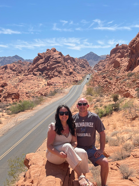 Valley of Fire State Park- And on our way out of town we stopped at Valley of Fire State Park. There is a $15 entrance fee but it was stunning. If you are in Vegas and want to get out of the city for a change of pace or are leaving Vegas to head to Utah or Arizona as we did, this is a fun stop on the way. It is only about 45 minutes outside of the city. There are several rock formations, trails, and view that are featured. We stopped and did an easy 1.5 mile roundtrip trail to the Fire Wave Rock and stopped on Mouse Tank road for an iconic photo session but there are so many other fun stops and shorter, trails throughout the park. You could spend a few hours or so like we did or spend an entire day there. It is HOT and the sun is STRONG so make sure you bring lots of water and apply your sunscreen! 😀